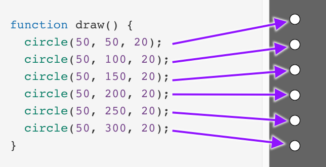 We only want to keep drawing circles until we reach the bottom circle, that has a y value of 200. The if statements make this explicit. Since y <= 200 all four times, this code has the same behavior as the previous version. (We would still have to add more code if we wanted the sketch to be able to draw more than four circles.)